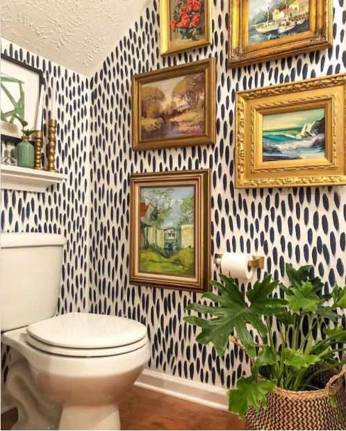 Half baths are one of the most fun places to play around with gallery wall ideas because you can create an impressive wall-to-wall look with fewer art pieces than you might imagine. Remember, this is a small room and a small amount of wall space that you have to fill—so play around with different art layout ideas to create a maximalist powder room.