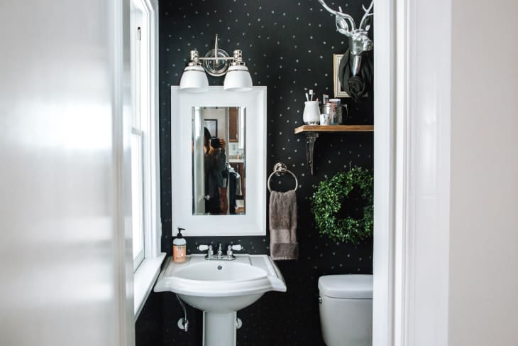 The half bath, if you’re lucky enough to have one, is one of the best rooms in a home to decorate, for a number of reasons. Sometimes called a powder room, they’re defined as a bathroom without the “bath” part—they typically only have a toilet and a sink. Usually on the small size, they don’t add a lot of square feet to your home, but they do add a lot of function. Not only are they great for using as a bathroom for guests, you can usually renovate them more affordably (since they are smaller and have fewer fixtures), and there’s less to clean when they’re in use. But most of all, half baths are the best room in the home to decorate because they’re a perfect canvas to experiment with bold decor ideas!