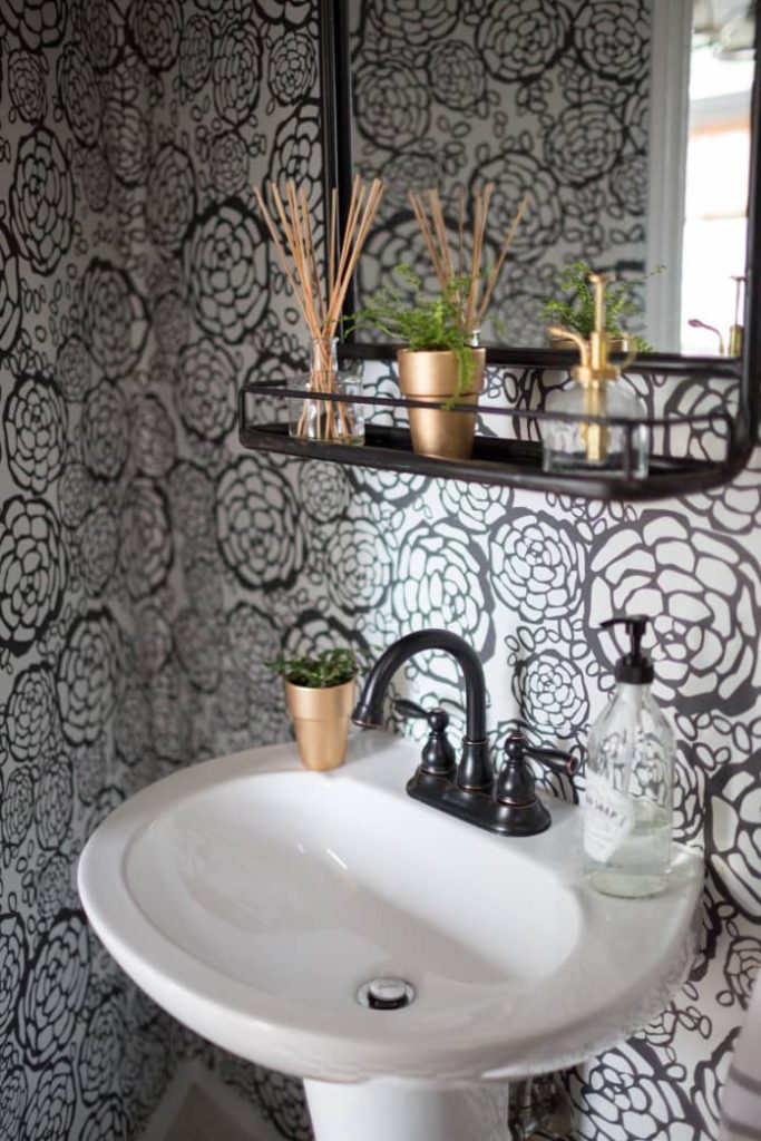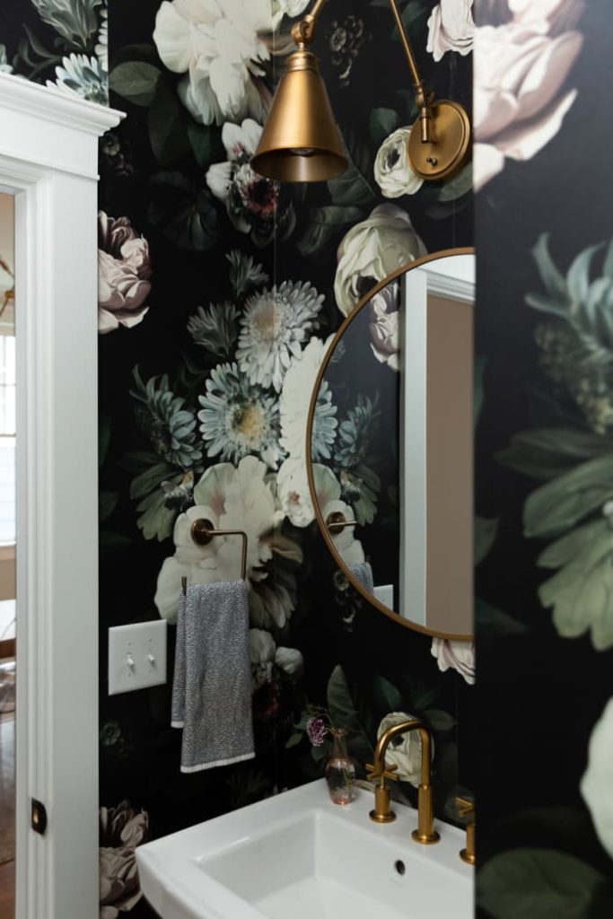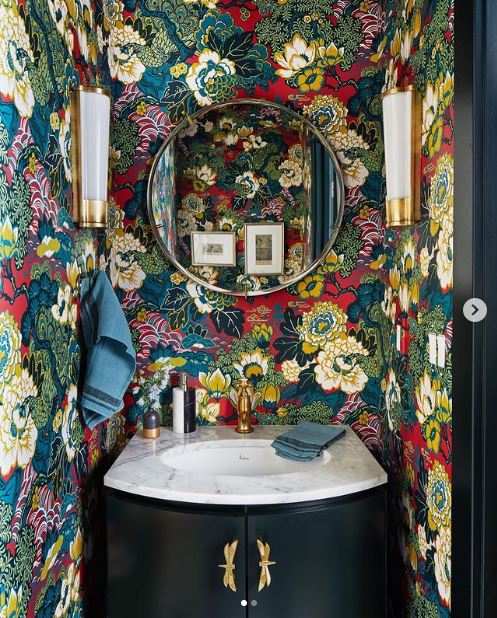 Because the half bathroom is a space not used by everyone or seen every day, it’s ideal for getting creative and trying out wild design ideas you’ve always dreamed of playing with, whether that’s in the form of paintwallpaper, or something else entirely! Another reason this is a great spot to experiment in is these rooms are usually so small you can splurge on expensive or luxurious materials and elements without actually spending a ton of money. Small spaces = less wall to cover with wallpaper and paint, and you can get away with buying smaller (and sometimes more affordable) versions of things. Petite half baths also means there’s less to cover up if you end up not liking your bold design choices… and you can just switch it up again without spending a lot of money or time!
