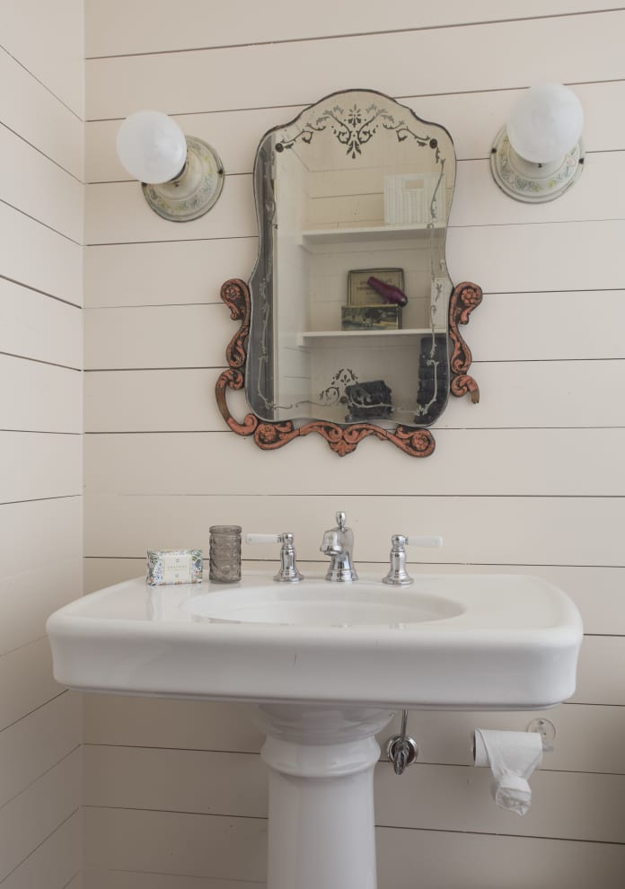 In a room as small as a half bath, choosing a dramatic light piece can be one of the only things you need to add pizzaz. The hanging pendant light in this New Orleans house has strong Art Deco vibes, setting the tone for the rest of the space. But you don’t have to focus on just hanging pendant lights, consider wall sconces or a vanity light upgrade above the mirror.