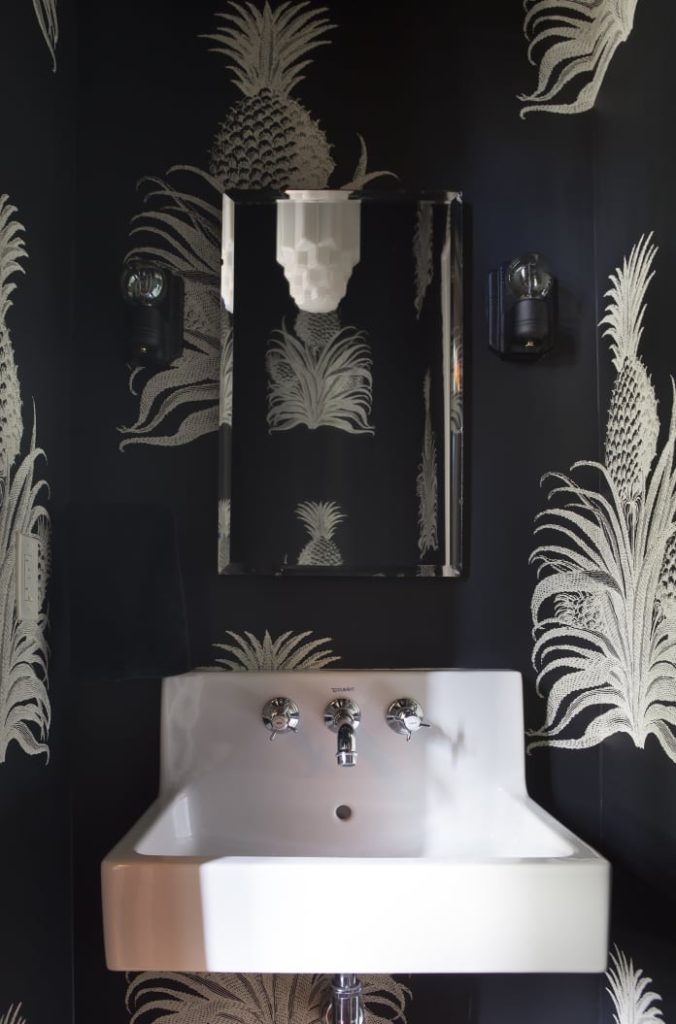 This interior designer’s ambitious DIY remodel has fun wallpaper design in a few different rooms, but the half bath’s hot pink oversized flamingo wallpaper steals the show. You can immediately see how a fun, energetic wallpaper pattern in a small space—like a powder room—can be a great way to inject personality into a small space.