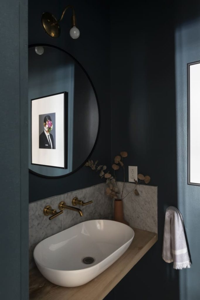 You may have heard some folks say you should avoid dark colors in small spaces, but that’s just not true in all cases. In this teeny powder room in this UK home, a dark paint color on the walls and the door—as well as in the floor tiles—creates a cozy little hug of a room.
