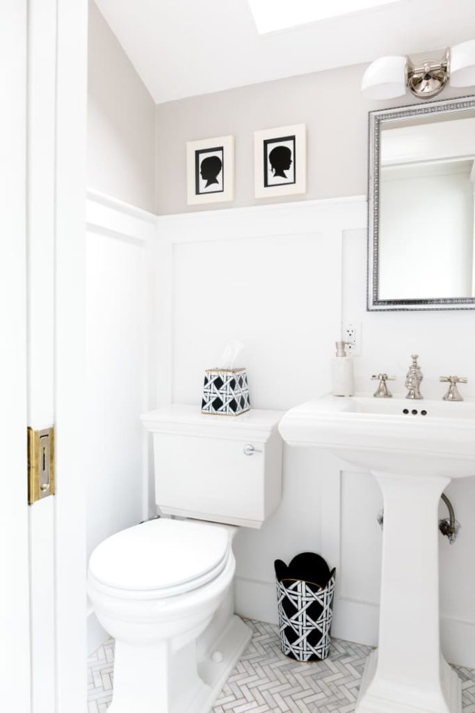 Lest you think you HAVE to go wild with wallpaper, color, or bold elements in your small powder room, this lovely little half bath in a cute New England house shows that you can create just as beautiful of a guest bathroom experience by keeping it simple with color, pattern, and decor.