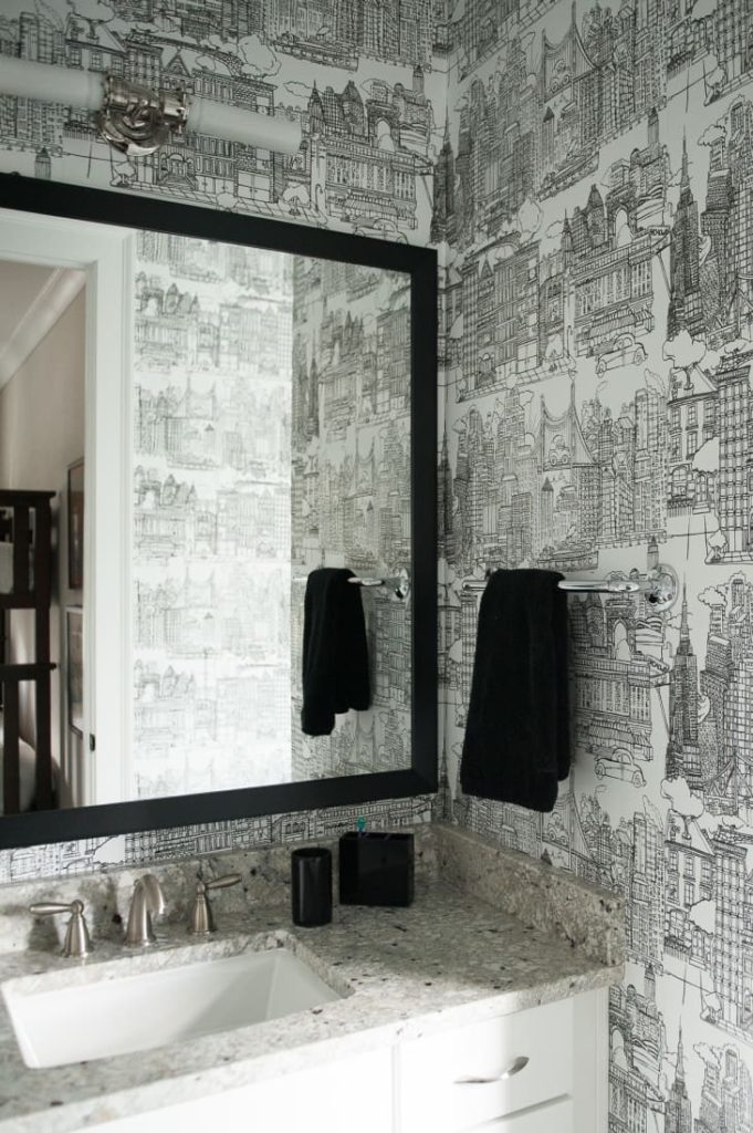 Patterns that might be too busy in larger rooms can fit in just perfectly in a small half bath, like the black and white graphic wallpaper in this Atlanta house. But you don’t have to just get graphic on the walls; consider contrasting patterns on hand towels, art, the counters, and more.